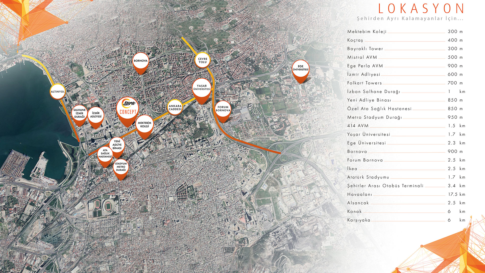 İş merkezleri, okullar, alış veriş merkezleri, üniversiteler, ulaşım alternatifleri ve sosyal yaşam alanlarının tam merkezinde yer alan Aura Concept; bulunduğu bölgeye göre aidat avantajı, daha büyük metrekarelere sahip daireleri, avantajlı fiyatları ve uygun ödeme olanakları ile hem yaşam hem de yatırım fırsatını bir arada sunuyor. Aura Concept, İzmir’in yaşayan lokasyonu Bayraklı’da sizi “Concept” sahibi yapmak için yükseliyor.